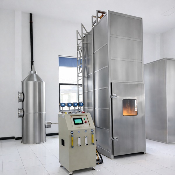 3.3.2 在箱頂部的后面打開一個(300±30)mm×(1000±100)mm的出氣口。試驗箱的后墻和兩側應采用傳熱系數約為0.7W.m-2.K-1的熱絕緣,1.5mm厚的USU304不銹鋼板,中間包覆65mm厚的保溫礦物纖維,外為1.5mm厚的USU304不銹鋼板。鋼梯與試驗箱后墻之間的距離為(150±10)mm,鋼梯*下面的橫檔距地面(400±5)mm。電纜試樣的*低處距地面約100mm。