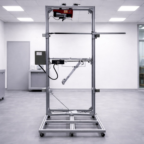 底座采用高強(qiáng)度鋁型材井字連接,穩(wěn)重便于運(yùn)輸,整機(jī)支架采用四立柱龍門結(jié)構(gòu),頂部裝有卷揚(yáng)機(jī),配合譯碼器準(zhǔn)確定位升降高度;