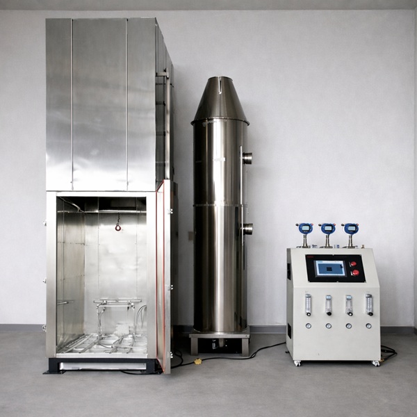 依據(jù)GB1094.11-2007, IEC 60076-11-2018標(biāo)準(zhǔn)要求等有關(guān)規(guī)定設(shè)計(jì)而成。當(dāng)給箱體供應(yīng)一定流量進(jìn)氣氣流,同時(shí)對(duì)樣品提供24KW 輻射照度。在酒精引燃的條件下對(duì)變壓器樣品進(jìn)行燃燒測(cè)試,并記錄煙管內(nèi)的煙氣密度及樣品的測(cè)試溫度